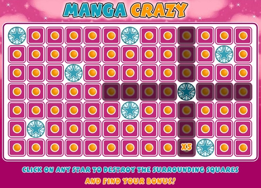 В бонусном раунде игрового автомата Manga Crazy вы увидите специальную таблицу со звездами. Вам нужно будет кликнуть по одной из них, чтобы узнать сумму выплаты. Она рассчитывается, исходя из общей ставки на спин. Далее игра сразу же возобновляется.