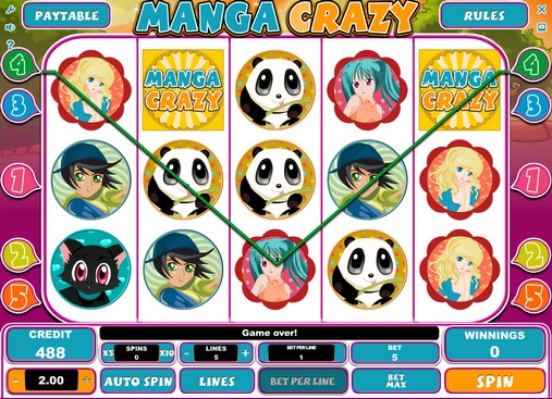 Manga Crazy – пятибарабанный видео-слот с тремя рядами картинок и пятью линиями. Активировать можно любое количество линий (по усмотрению клиента). В игре есть бонусный раунд, особые символы и некоторые другие опции.