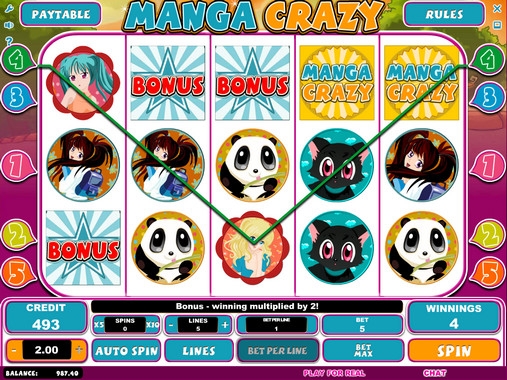 Помешательство на Манге яркий и красочный игровой автомат.В Азии будет очень популярным ведь там комиксы пользуются большим успехом отсюда название и оформление игрового аппарата.Отметить так же нужно щедрую бонусную программу.