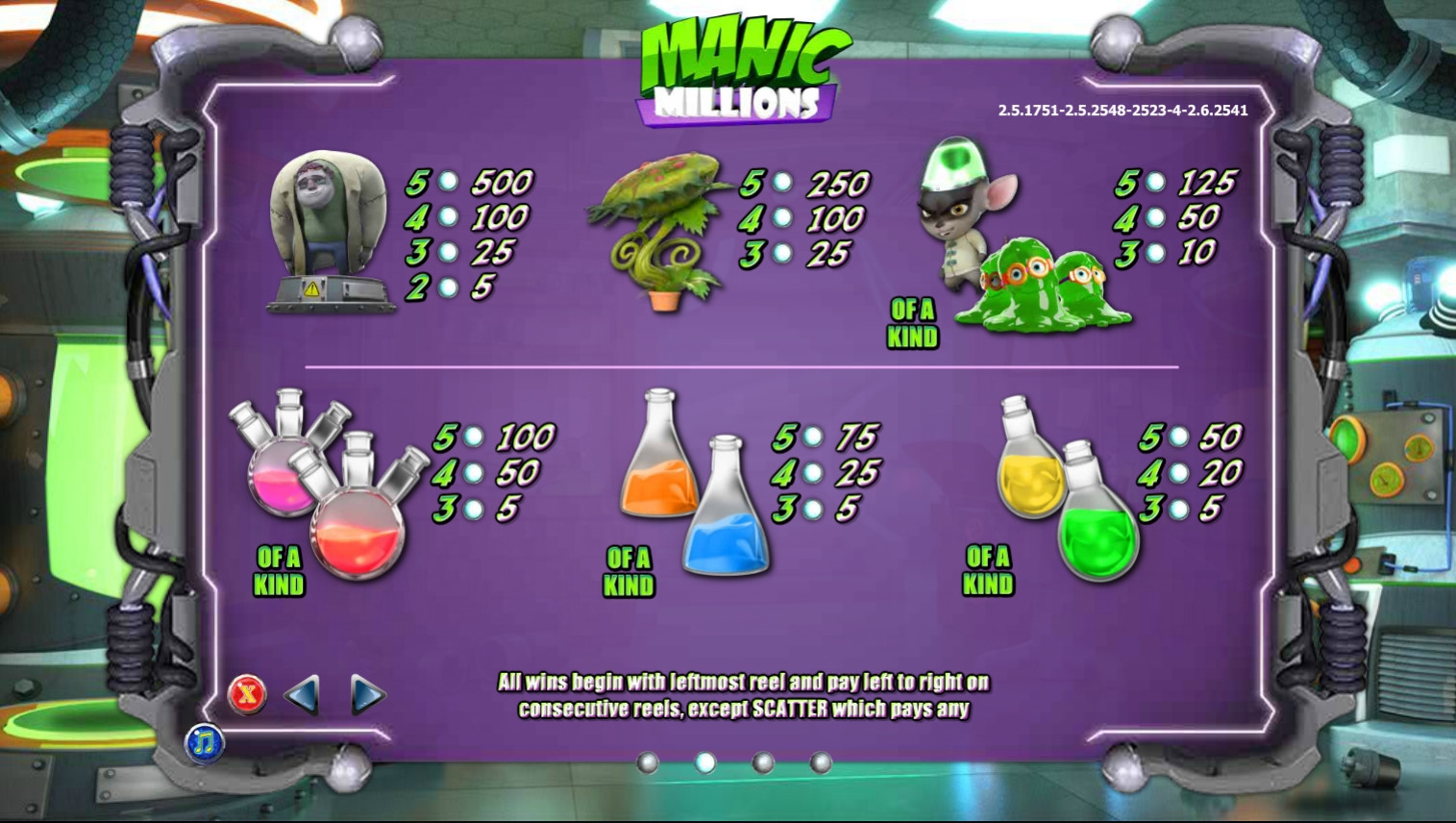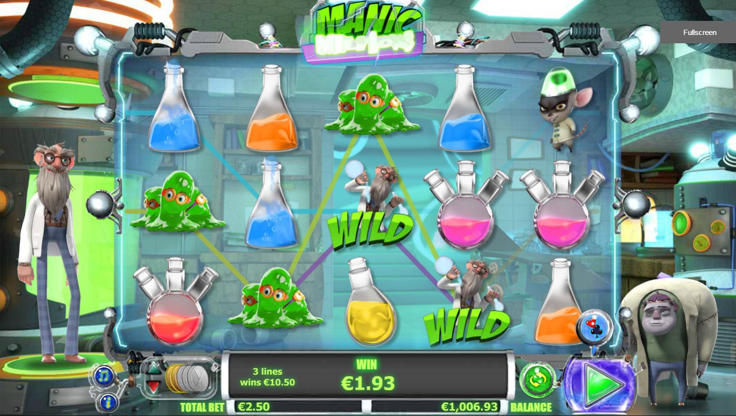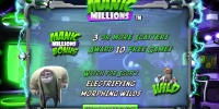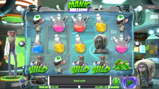 Открыв игровой автомат Manic Millions, вы увидите нескольких странных созданий, которых, видимо, сотворил профессор. Это его главный монстр, а также чудные растения, слизни в круглых очках, загадочное растение и так далее. Кроме того, появляются мензурки, колбы и пробирки с разноцветными жидкостями.