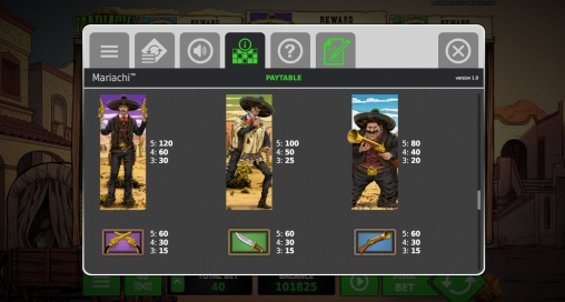 На барабанах видео-слота появляются буквы, цифры, музыкальные инструменты и три мариачи. Народные музыканты могут занимать в колонках по четыре ячейки.