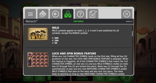 В Mariachi доступны стандартные картинки, джокеры, бонусные символы, джекпоты, функция Lock and Spin и бесплатные вращения с альтернативным набором изображений.