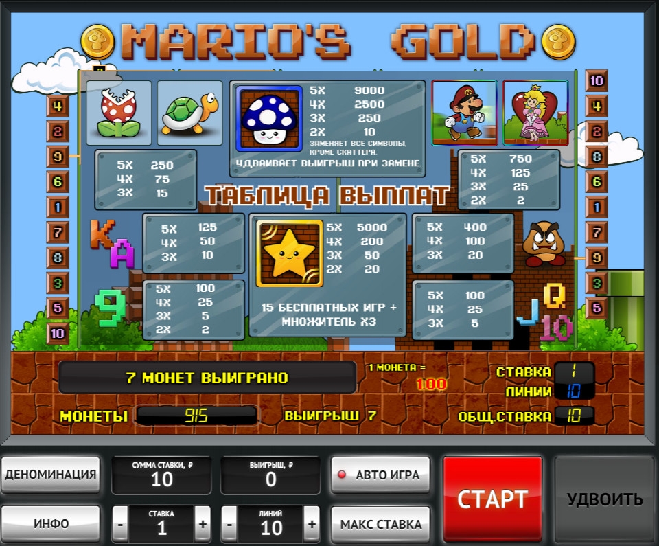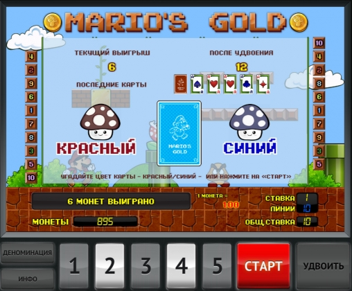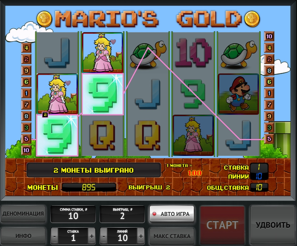 Видео-слот «Золото Марио» полностью русифицирован, что поможет вам самостоятельно разобраться во всех элементах управления игровым процессом.