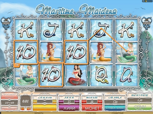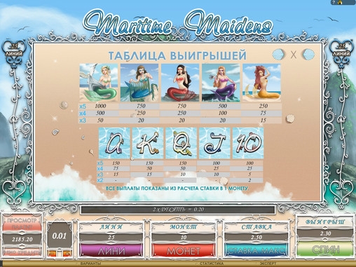 Играть на игровом автомате Maritime Maidens разрешается по одной – двадцати пяти линиям. Ставка на линию делается в монетах (до двадцати). Их номинал варьируется по усмотрению пользователя в диапазоне от одного до двадцати центов. Следовательно, на спин принимается до ста долларов.