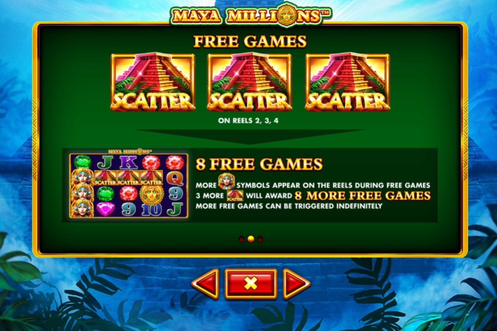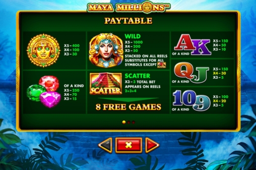 В игровом автомате «Миллионы майя» пять барабанов и сорок постоянно активных полос. Иконки располагаются на экране в четыре ряда.