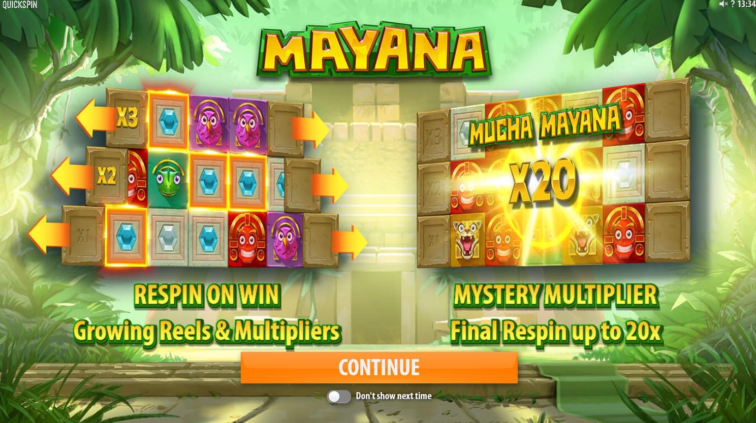 Компания Quickspin продолжает удивлять нас оригинальными возможностями новых игровых автоматов. Знаменитый разработчик софта представил уникальную модель Mayana, посвященную древнему народу майя. Она отличается изменяемым количеством барабаном, необычной системой множителей, частыми респинами и другими нестандартными особенностями.