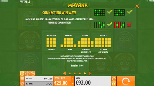 В видео-слоте Mayana пять барабанов, но с началом спина доступны лишь три из них. В колонках помещаются по три картинки.