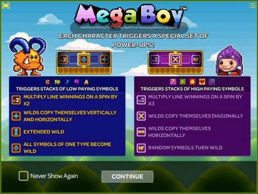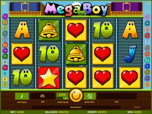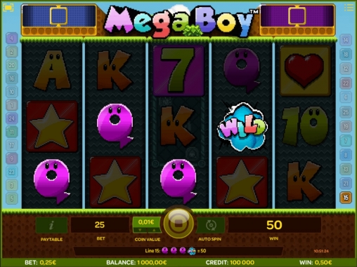 «Мега-Бой» представляет собой онлайновый игровой автомат с пятью барабанами, двадцатью пятью линиями, пятнадцатью картинками на экране и широким выбором функций: особыми и базовыми символами, бесплатным спинами и бонусными опциями разных типов.