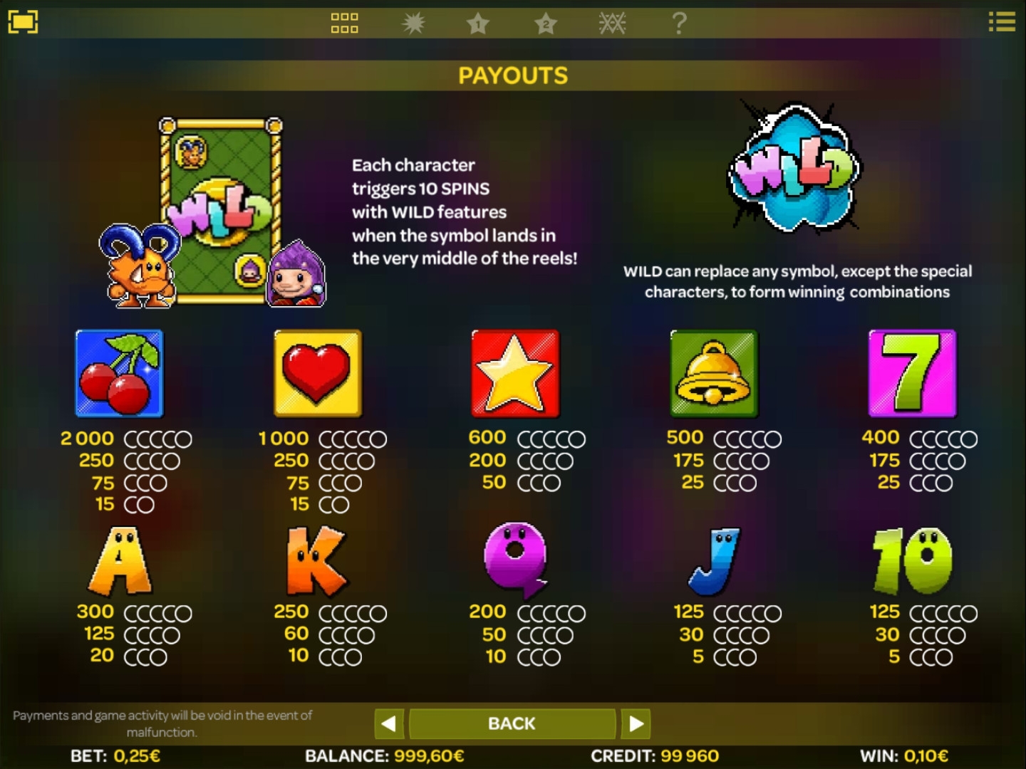 На экране слота вы увидите примитивные изображения вишенок, звездочек, сердечек, колокольчиков, семерок и номиналов игральных карт (с бегающими глазами). Эти картинки могут появляться в виде полос на барабанах, благодаря чему иногда они занимают целые колонки.