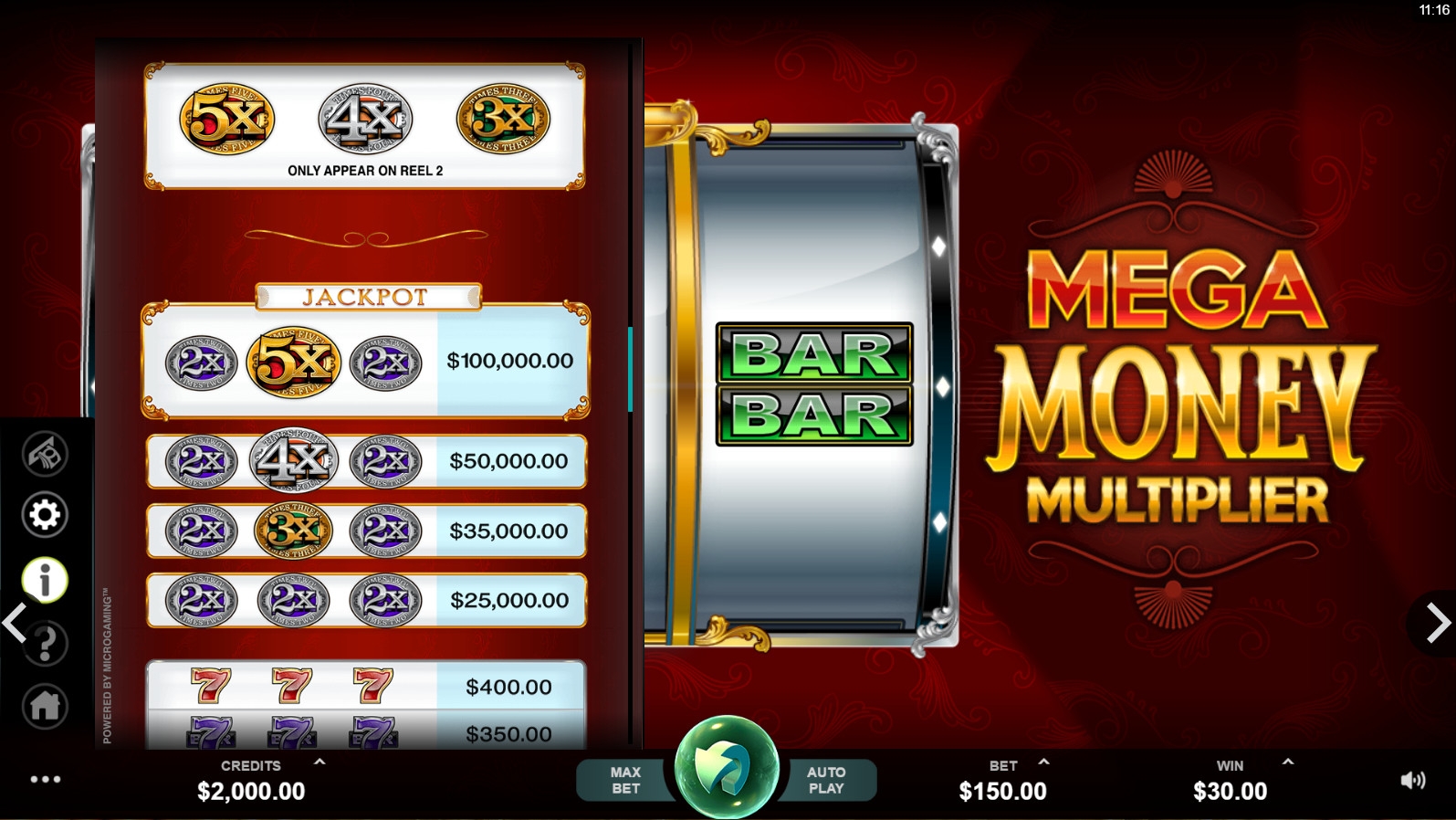 Накопительные джекпоты Microgaming в видео-аппарате Mega Money Multiplier не разыгрываются. Фиксированные джекпоты разыгрываются при участии множителей. Они рассчитываются по коэффициентам от х2500 до х10000. Подробная таблице есть в справке.