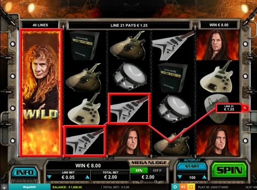 В видео-слоте Megadeth пять барабанов и сорок постоянно активных линий. Играть на игровом автомате можно по ставке на линию от одного цента до шести евро, так что всего разрешается ставить на спин до двухсот сорока евро (на примере Unibet Casino Black).