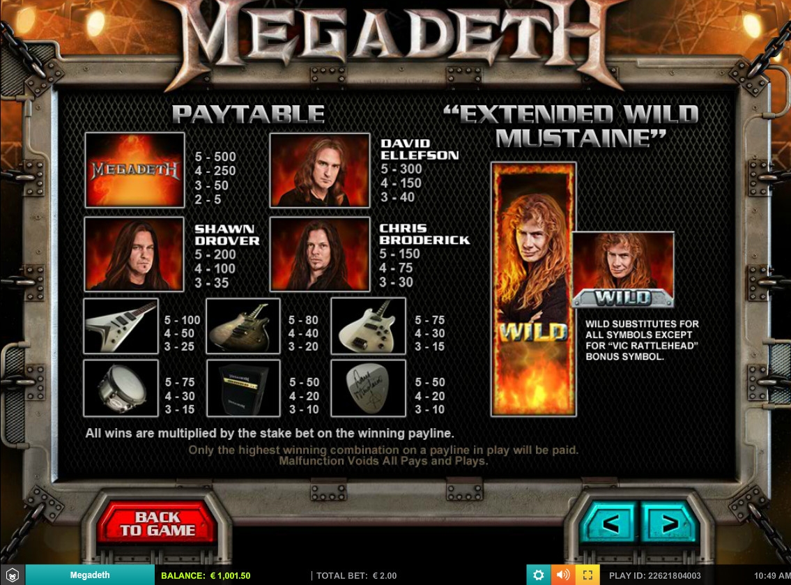Подсказки по игре появляются в информационной строке над барабанами. В слоте Megadeth предусмотрена возможность отключения звуков и музыки.