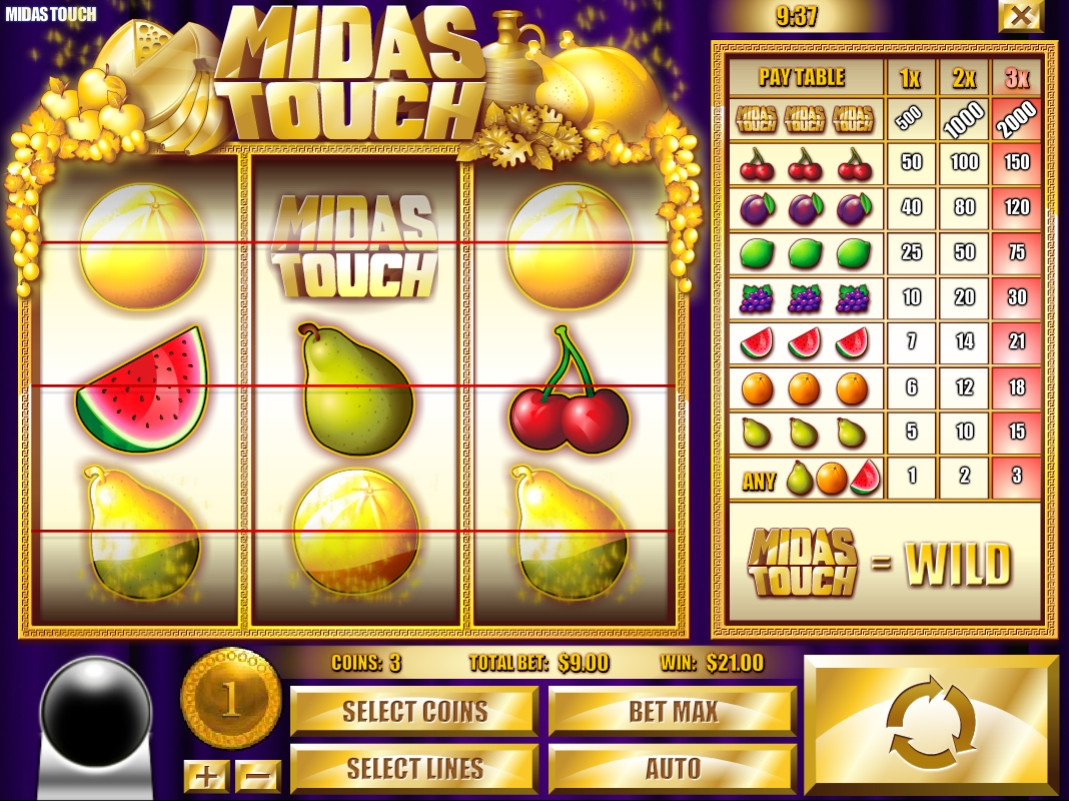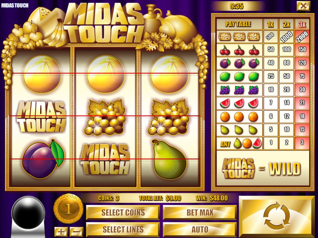 «Прикосновение Мидаса» трехбарабанная модель с тремя активными полосами и девятью картинками на центральном экране . отлично подходит для любителей классики. Но существенным отступлением от традиционных правил является джокер. Интересно поиграть .