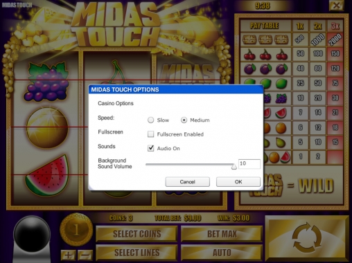 По вкладке Options запускается окно настроек звука, экрана, скорости геймплея и других параметров. Открывается игровой автомат Midas Touch в браузере. Мобильная версия предназначена для смартфонов.