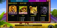 - Wild (лев) выпадает лишь в третьей, четвертой и пятой колонках, из-за чего не может сам формировать комбинации. Он заменяет в последовательностях другие символы, кроме скаттеров.