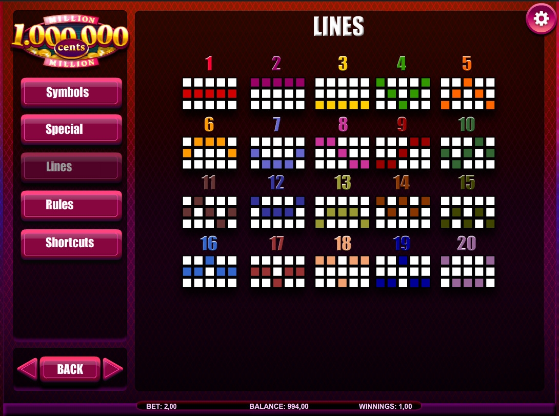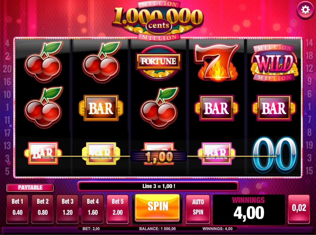 «Миллион центов HD» - бесплатный игровой автомат с пятью барабанами и двадцатью постоянно активными линиями. На каждую из доступных позиций можно поставить до пяти монет номиналом один, два, пять или десять центов. Ставки на все линии одинаковы. На раунд принимается до десяти евро (на примере NetBet Casino).