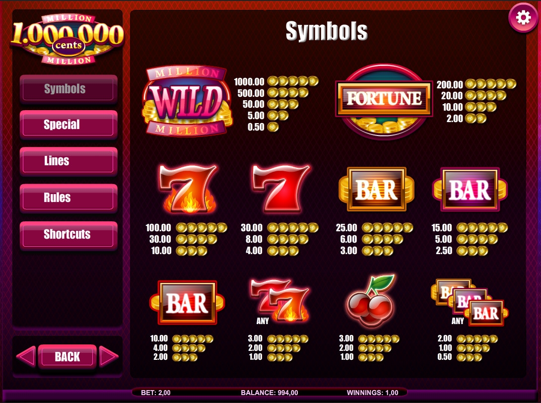 Также на барабанах появляются цифры 10, 0 и 00. Они служат для розыгрыша бонусной выплаты 1 000 000 центов, в честь которой названа игра.