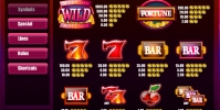 На экране игры появляются разноцветные надписи BAR, красная и пылающая семерки, вишенки и слово FORTUNE. BAR могут формировать смешанные комбинации, которые оплачиваются по отдельным коэффициентам.