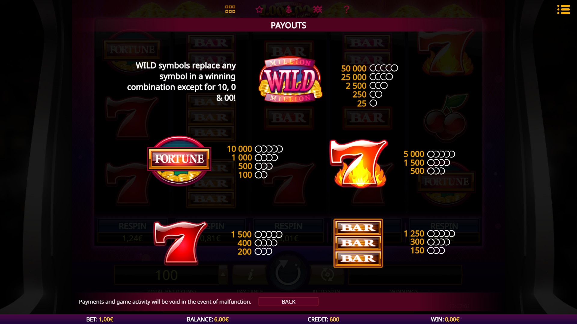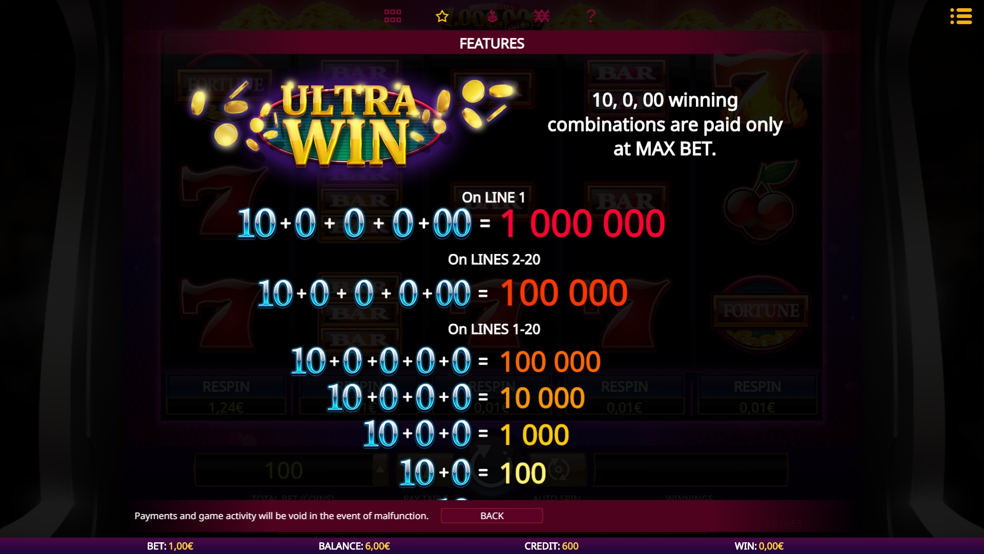- 1 000 000 монет начисляется за комбинацию из символов 10, 0, 0, 0 и 00 на первой (центральной) линии.