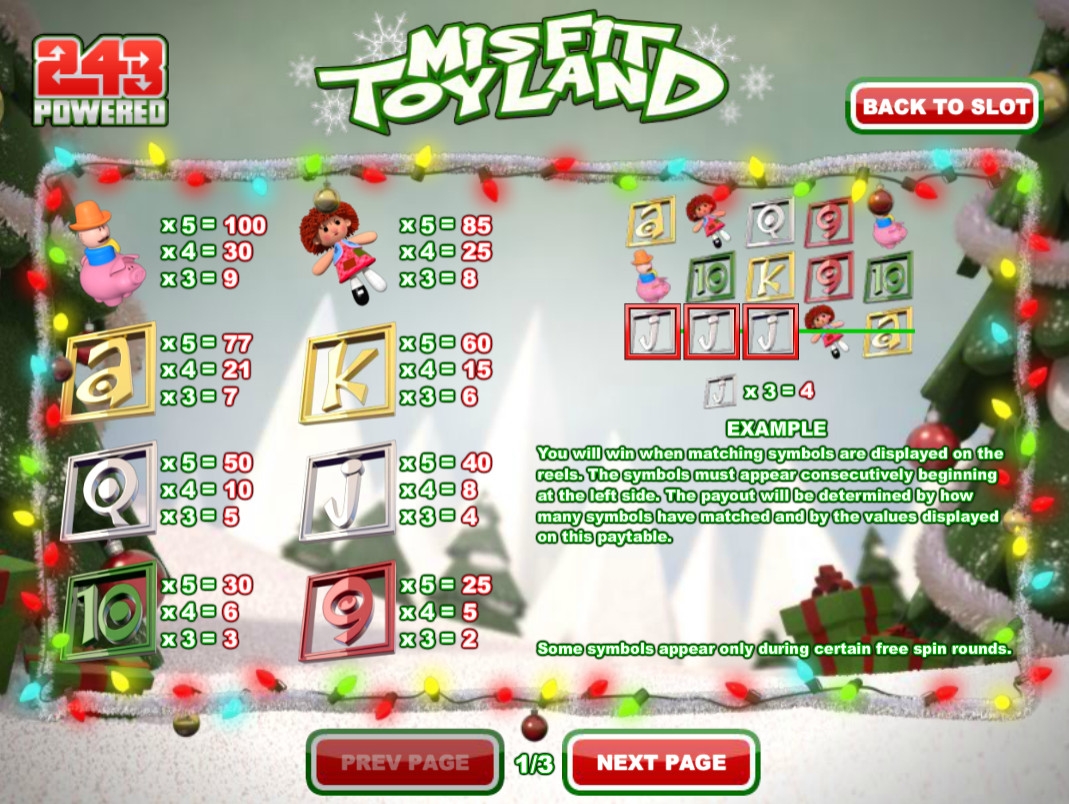 Игры на удвоение в Misfit Toyland нет. Подробнее о разных типах символов и бонусных опциях читайте ниже в обзоре Casinoz.