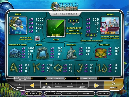 Mission Atlantis - это пяти-барабанный видео-слот с 25-ю линиями выплат, производства Oryx Gaming. В игре используется "wild"-символ, символ "scatter", есть множитель, свободные вращения и бонусная игра.