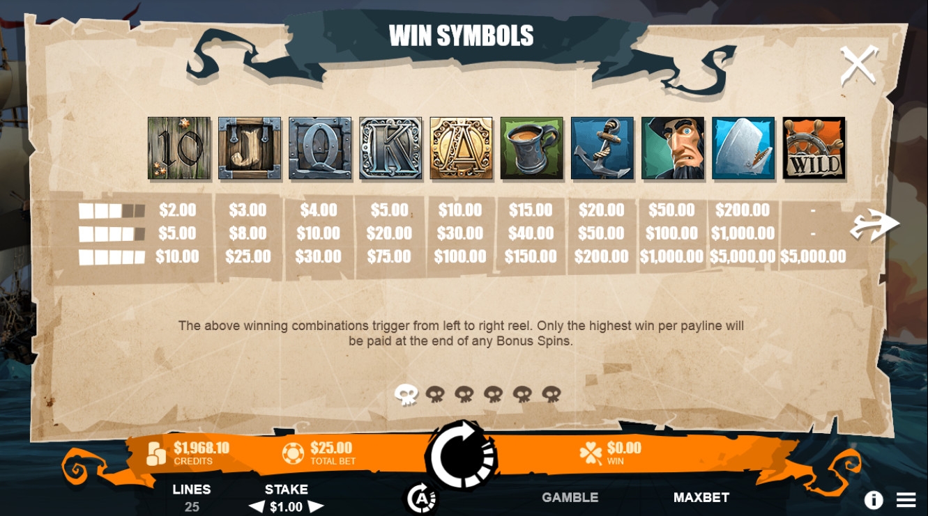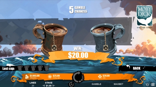 Играть на автомате Moby Dick можно лишь по двадцати пяти полосам. На каждую разрешается ставить от одного цента до двух долларов (0.25 – 50 долларов на спин).
