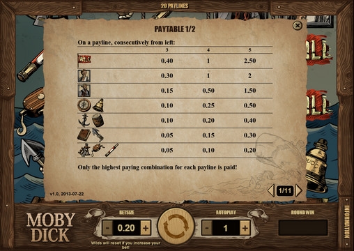 Играть на игровом автомате Moby Dick можно только по всем двадцати линиям. На каждую из них принимается ставка в диапазоне от одного цента до одного доллара. На спин можно поставить до двадцати долларов.