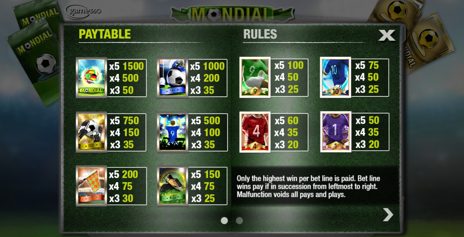 Студия Game 360 порадовала футбольных болельщиков игровым автоматом Mondial. Если вы увлекаетесь футболом, вряд ли вам нужно разъяснять, что словом «мундиаль» традиционно называют чемпионаты мира этому виду спорта. Характеристики и возможности новинки рассматриваются в обзоре Casinoz.