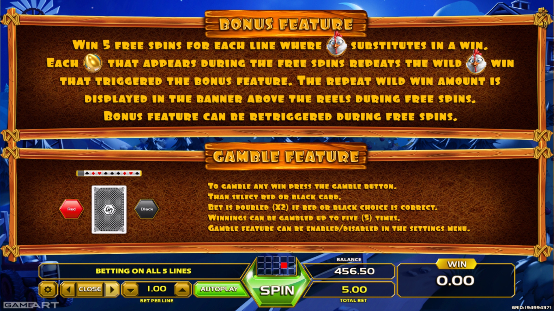 очень интересная и красочная модель игрового автомата, есть бесплатные вращения. Пять фри-спинов полагается за каждый символ Wild, есть особые символы Wild (курица) и Scatter (яйцо). Понравилось, рекомендую
