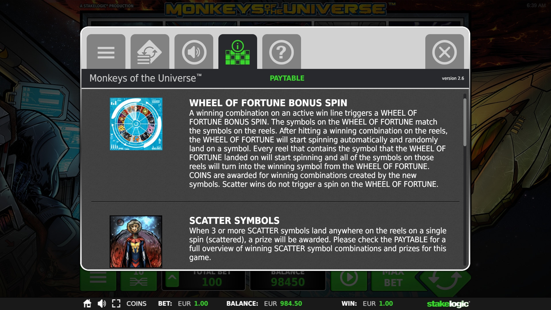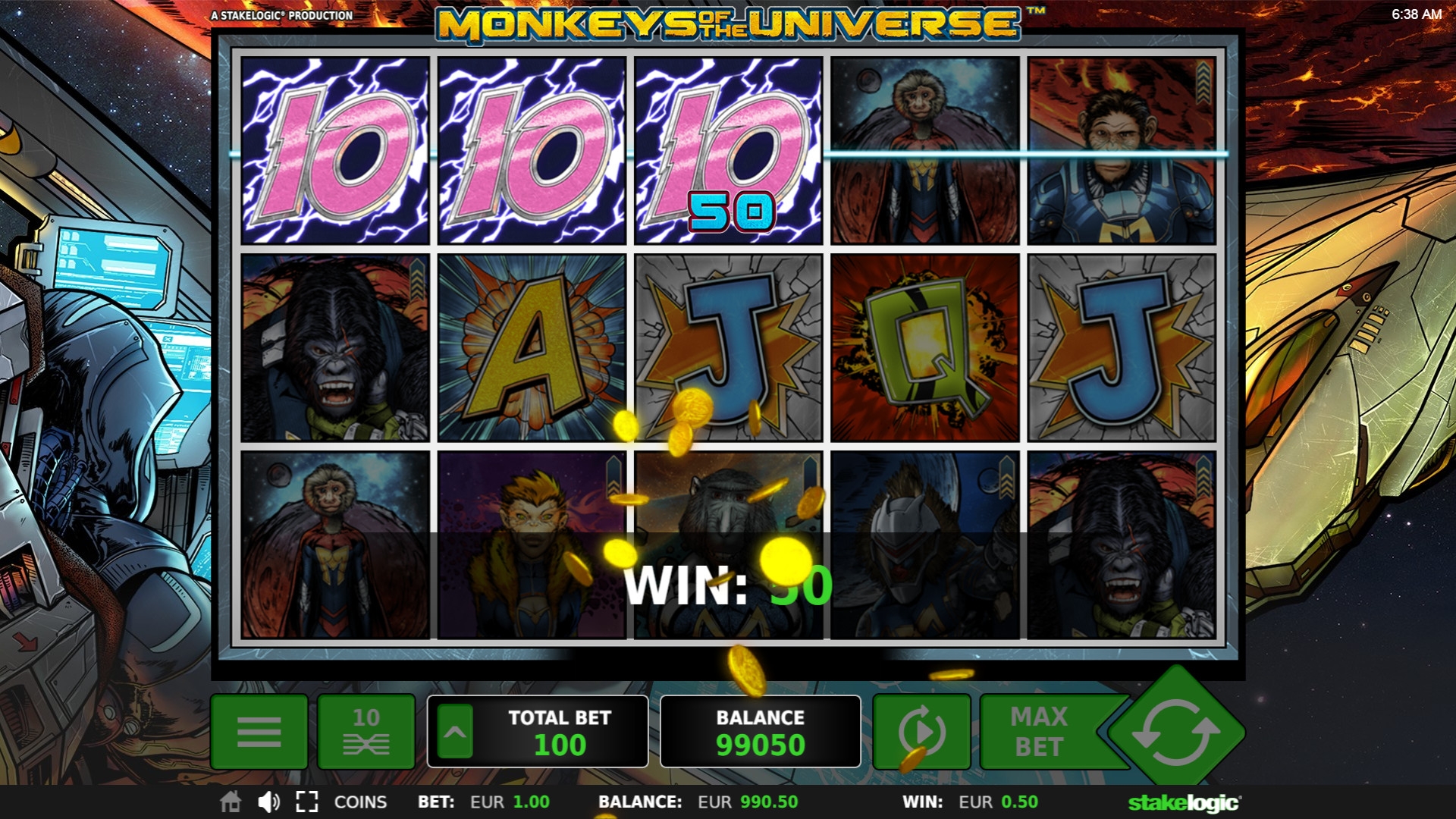 «Обезьянки вселенной» - модель с пятью барабанами и десятью линиями, на экране которой одновременно помещаются пятнадцать картинок. Количество активных полос всегда остается неизменным, а ставки по ним равны. Вы можете поставить на каждую до десяти монет достоинством 0.01, 0.02, 0.05, 0.10, 0.20 или 0.50 евро. Так что на раунд принимается от десяти центов до пятидесяти евро.