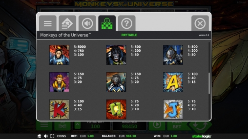 Видео-слот Monkeys of the Universe выдержан в стиле комиксов о супергероях. Его главными персонажами стали обезьяны, покоряющие необъятные космические просторы и защищающие свою планету от нависшей над ней угрозы.