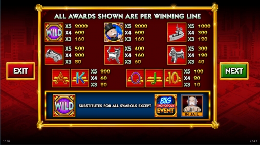 На экране автомата появляются номиналы карт и предметы, имеющие отношение к традиционной «Монополии». Особыми возможностями наделены символы Wild, Bonus (логотип) и In Jail (человечек за решеткой).