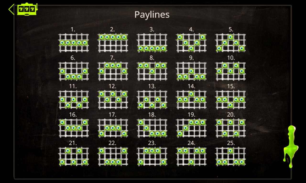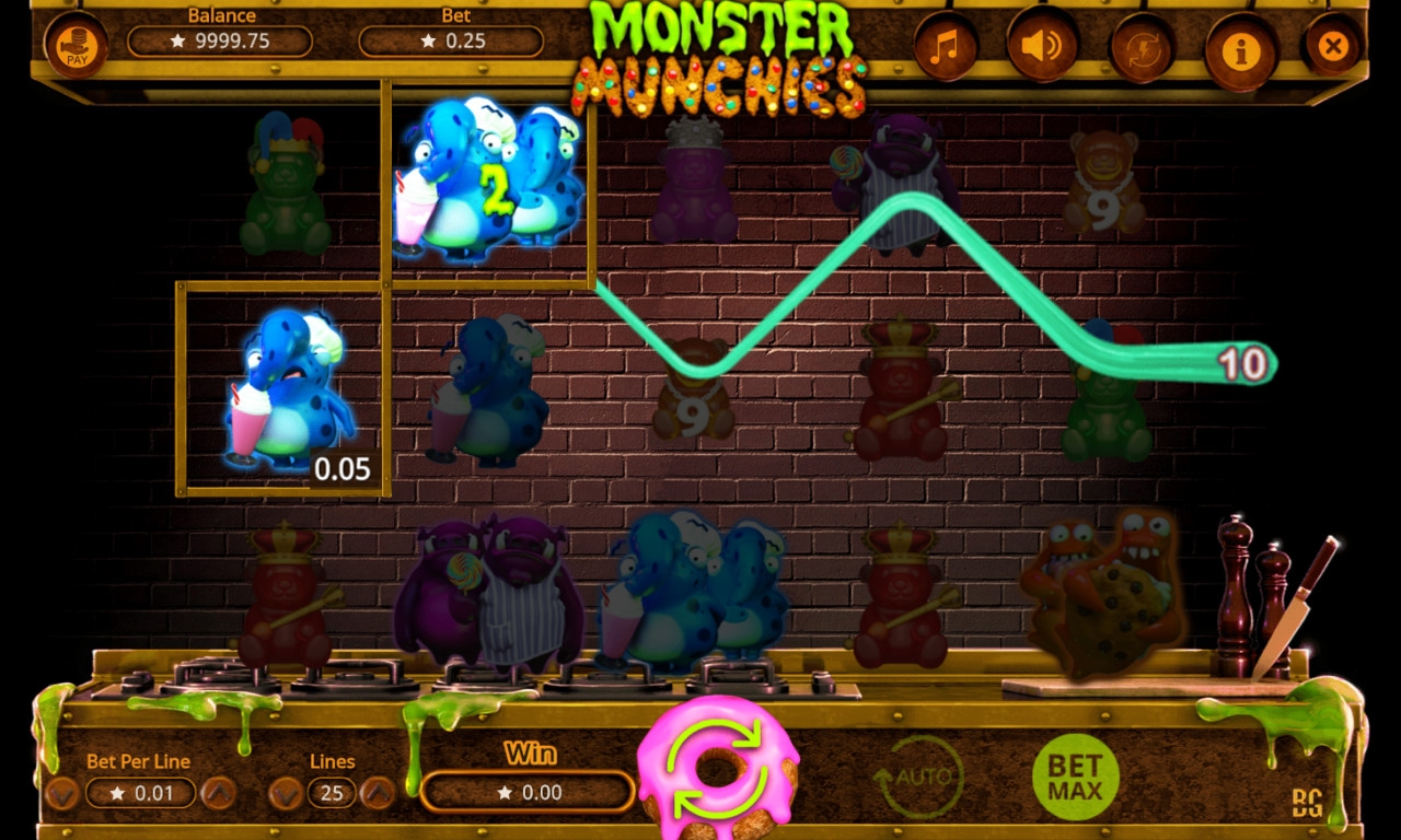 Видео-слот Monster Munchies имеет пять барабанов с картинками, выстраивающимися на экране в три ряда.