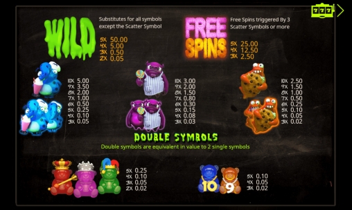 Выплаты рассчитываются умножением ставки по одной полосе на коэффициент сложившейся комбинации. В Monster Munchies они бывают от х2 до х5000. При начислении кредитов деньги автоматически выводятся на счет, так как игры по равным шансам нет.