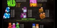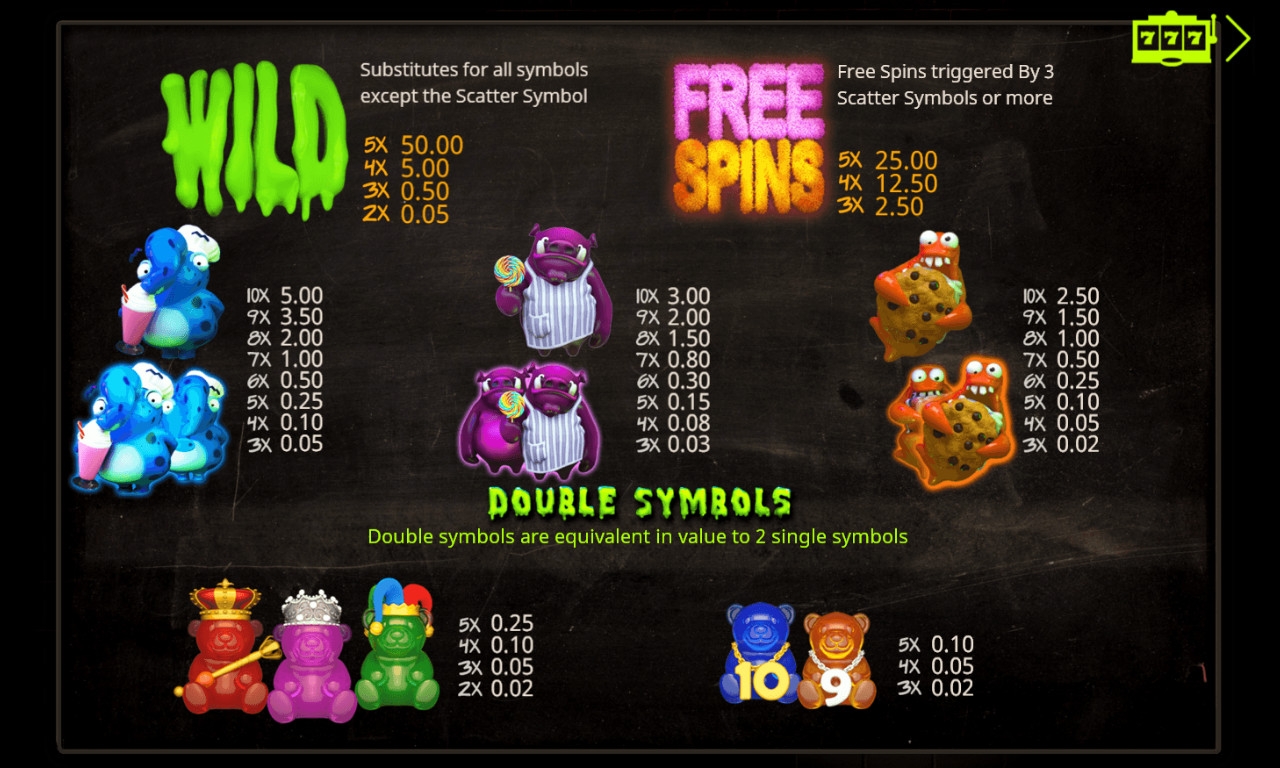 На барабанах игрового аппарата изображены различные сладости и необычные создания, которые с удовольствием поедают вкусняшки. Монстры бывают одинарными и двойными, что позволяет им формировать цепочки из трех – десяти одинаковых элементов.