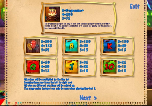 В видео-слоте Monsters’ Party разыгрывается прогрессивный джек-пот. Он растет с каждой ставкой, которую делают игроки. Отчисляется 4% ее сумма. Чтобы выиграть джек-пот, нужно, играя по ставке пять монет, собрать на активной линии комбинацию из пяти тортов. Если подобная комбинация выпадает по другой ставке, пользователю полагается выплата, которая рассчитывается по коэффициенту х800.