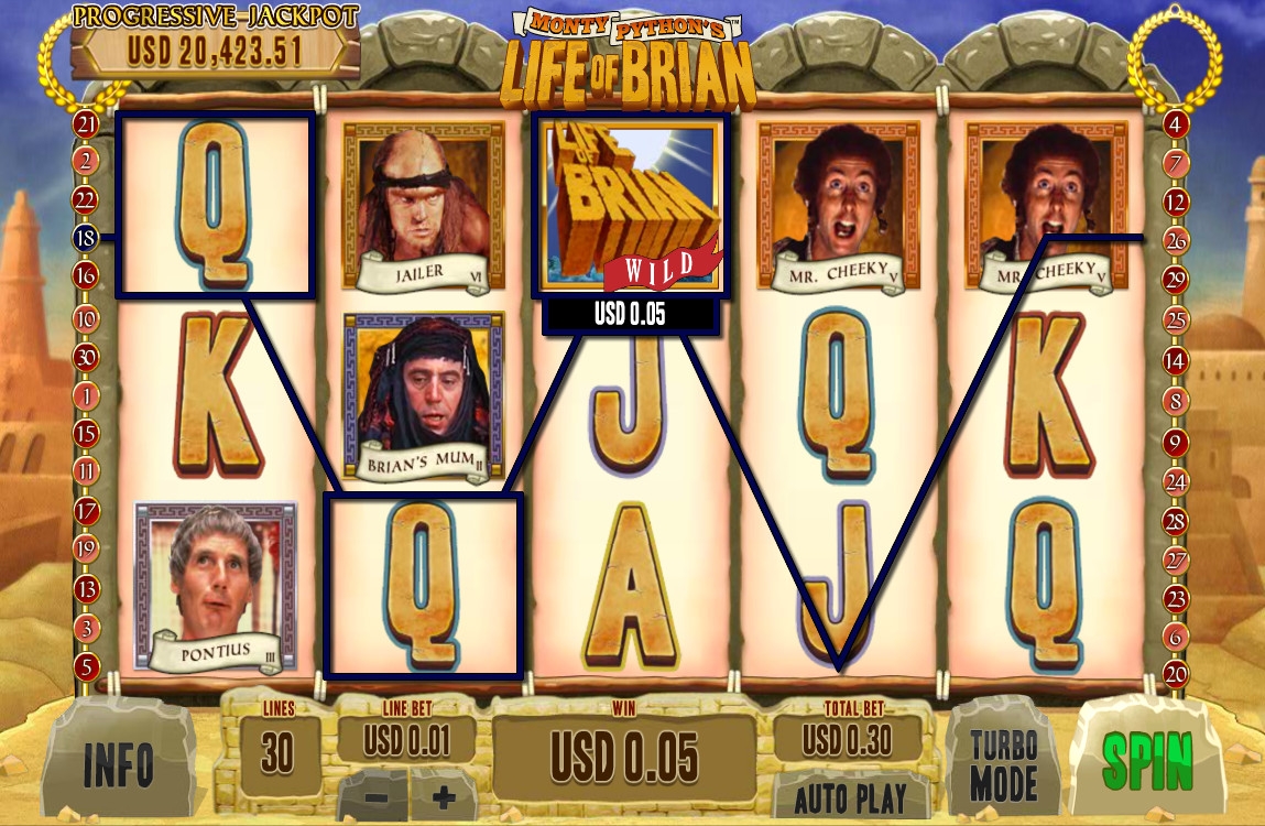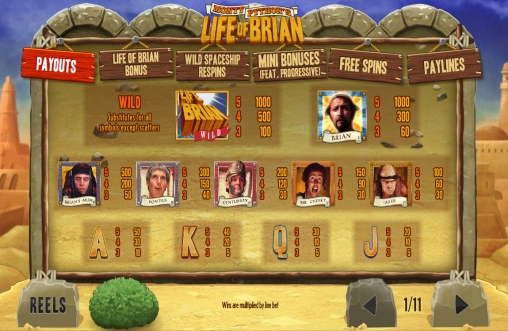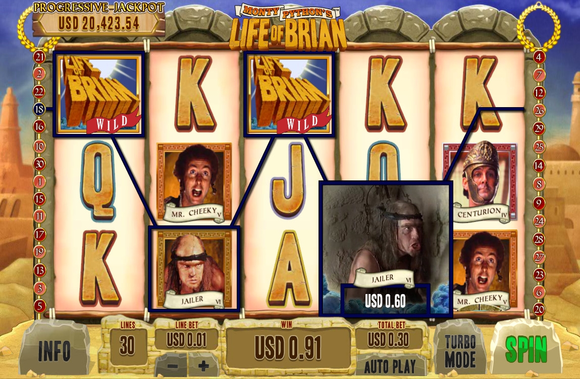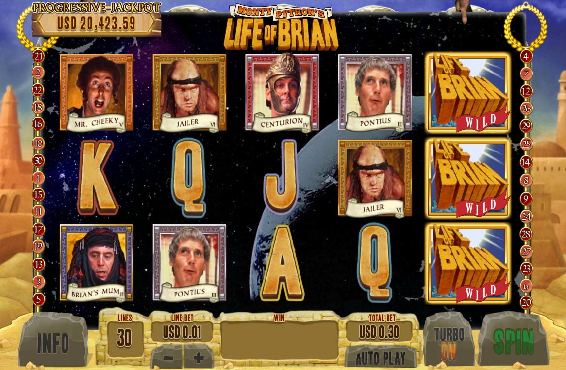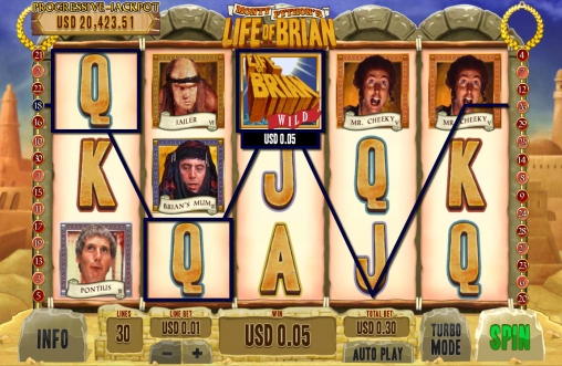 На экране видео-слота появляются картинки с изображениями героев фильма «Житие Брайна по Монти Пайтону», а также буквы, обозначающие номиналы карт от валета до туза.