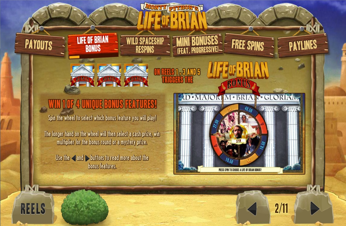 Тематические бонусы Life of Brian начинаются с запуска колеса фортуны, которое определяет, в какой именно призовой игре вы будете принимать участие. Их четыре: