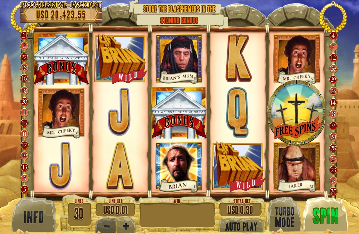 В игровом автомате «Житие Брайана по Монти Пайтону» разыгрывается накопительный джек-пот. Его можно сорвать в мини-игре Foot of God. Ничего особенно делать не нужно – все зависит от воли генератора случайных чисел.