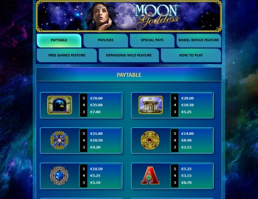 Moon Goddess может похвастаться очень мощным и информативным справочным разделом. Он открывается в отдельной вкладке и содержит несколько страниц с таблицей выплат, схемой расположения активных линий, подробным описанием всех функций и детальной инструкцией, как играть на видео-слоте.