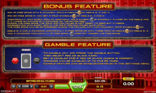 Список реализованных в игре функций состоит из простых и особых символов, дополнительных множителей, раунда на удвоение выплаты, призовых вращений и уникальных бонусов.