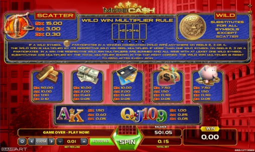 На экране видео-слота More Cash появляются золотые слитки, пачки долларов, кредитные карты, мешки с наличными, копилки с монетами и номиналы карт от девятки до туза.