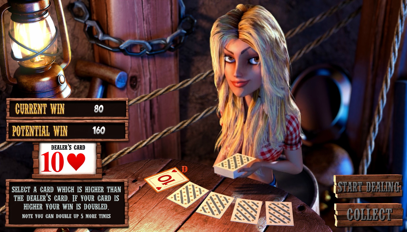 По окончательному завершению спина выигранные деньги можно попытаться увеличить в раунде на удвоение. Игра по шансам выдержана в классических традициях, но необычно оформлена. Вам предстоит сыграть в карты с очаровательной девушкой. Правила традиционны. Вы наугад выбираете одну из четырех закрытых карт. Если она окажется старше открытой карты, выплата удвоится. Ошибаться нельзя. В одном раунде можно играть до пяти раз подряд.