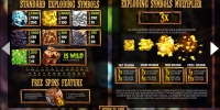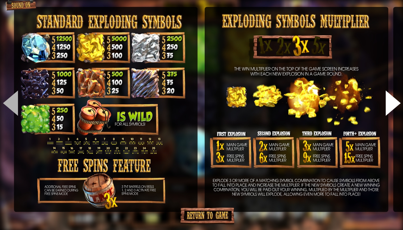 Большинство обычных картинок, появляющихся на барабанах, - это различные драгоценные камни и металлы. Есть также специальные символы Wild (динамит) и Free Spins (бочка с взрывчаткой).