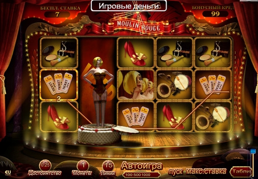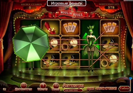 Очень интересный игровой аппарат "Мулен Руж" Хорошо, что есть возможность поиграть бесплатно. Прекрасная 3-Д графика, колоритные персонажи в виде танцовщиц привлекают внимание играющих. Удачи всем и везения
