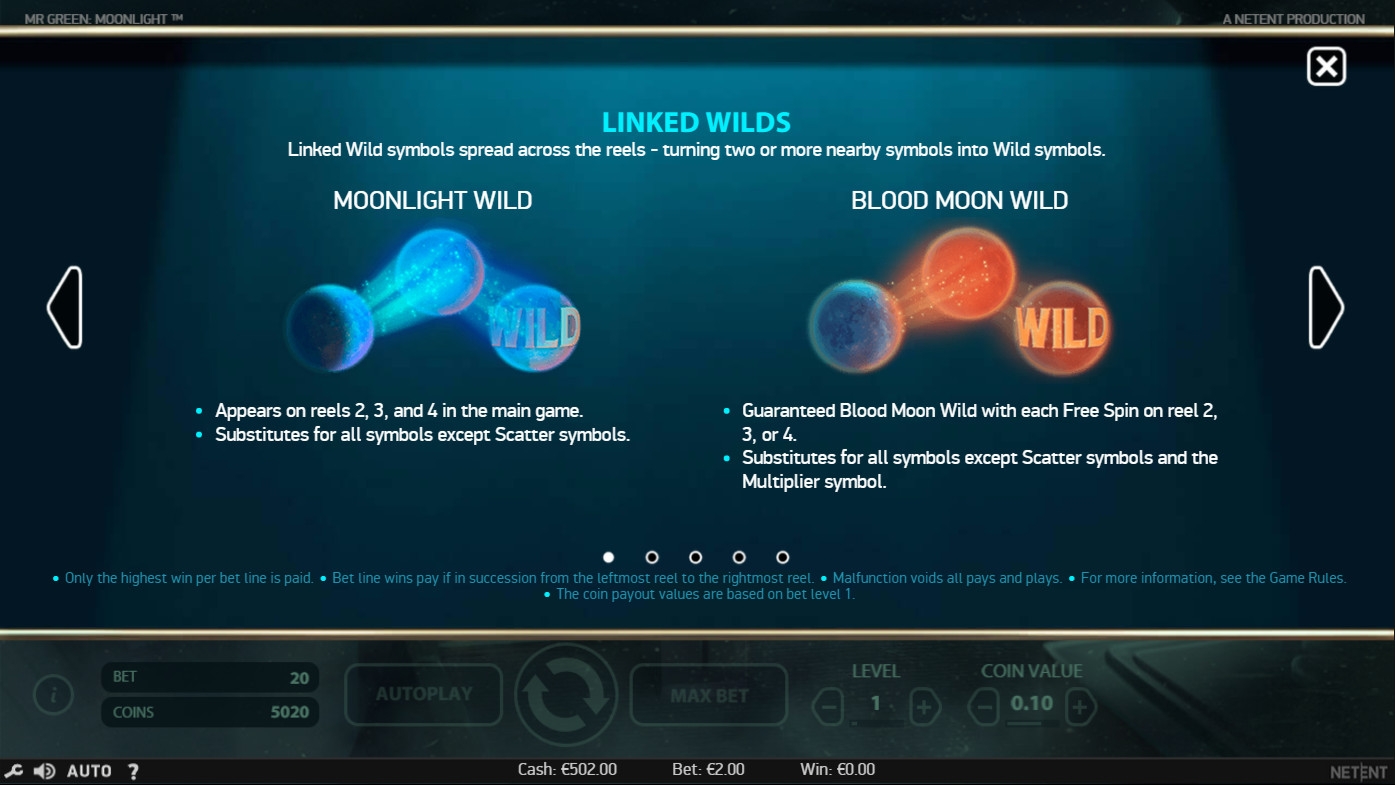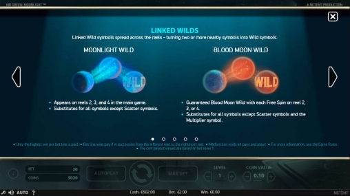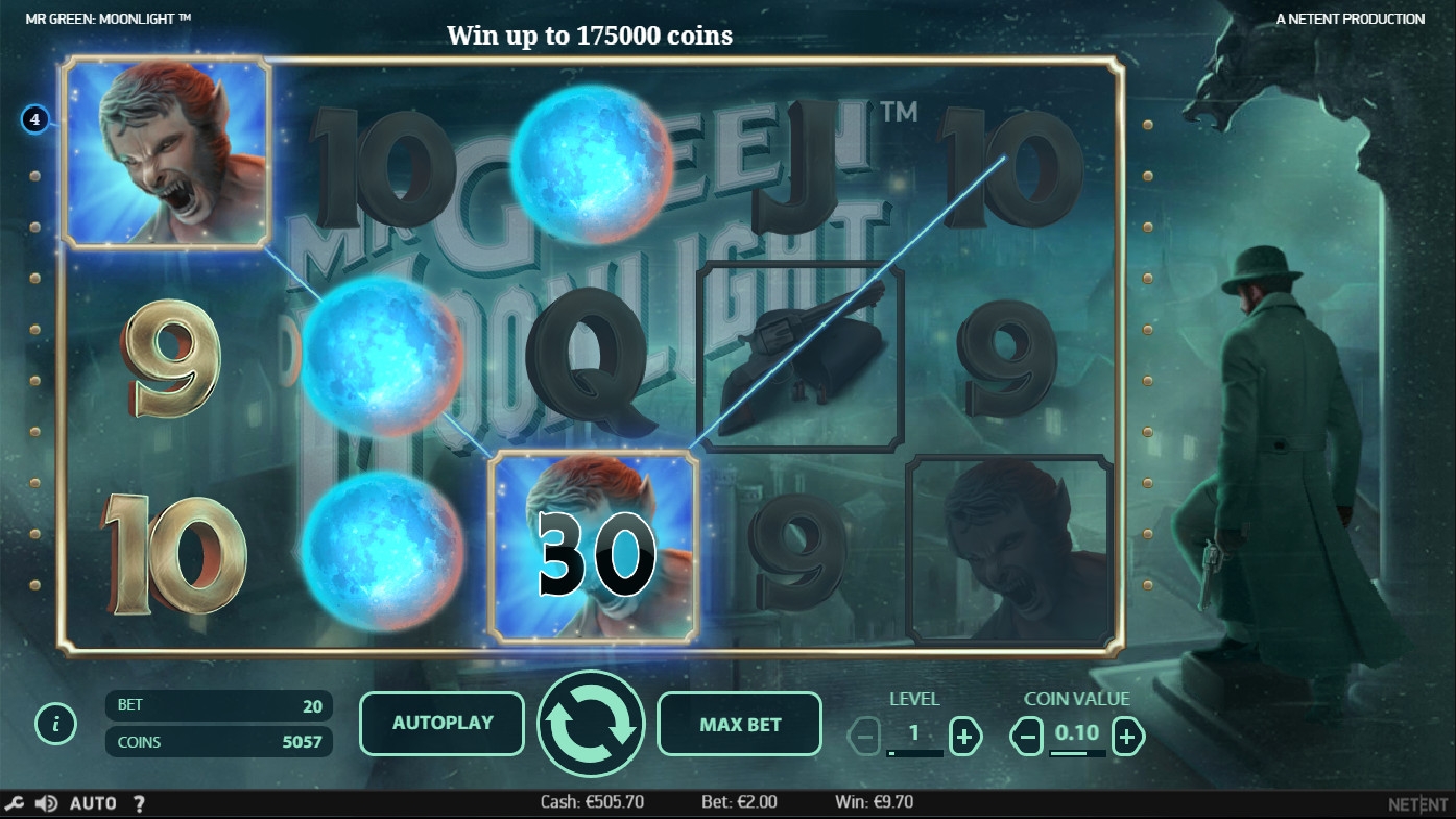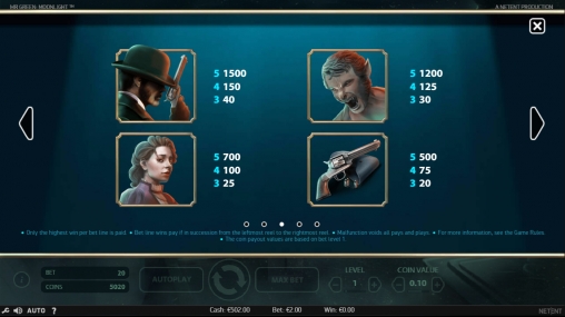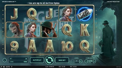 В Mr Green: Moonlight пять барабанов, пятнадцать символов на основном экране и двадцать постоянно активных линий, на которых образуются выигрышные комбинации. Ставки по всем двадцати позициям неизменно равны. Они варьируются по желанию пользователя в диапазоне от одной до десяти монет достоинством 0.01 – 0.50 евро. Следовательно, на спин принимается не менее двадцати центов и не более ста евро.