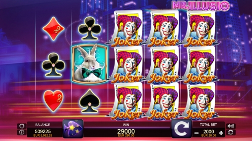 В игровом аппарате «Мистер Иллюзио» пять барабанов, двадцать фиксированных линий и пятнадцать ячеек для картинок на основном экране.