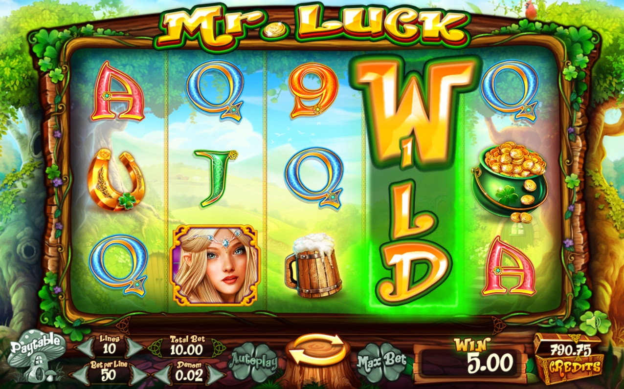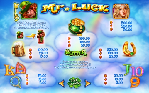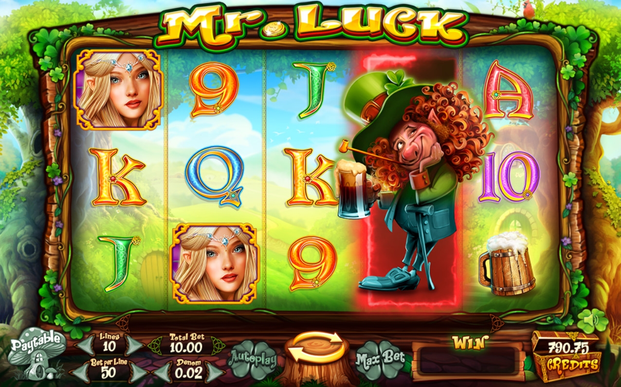На барабанах видео-слота Mr. Luck можно увидеть шесть номиналов игральных карт, пенистое пиво в деревянной кружке, золотую подкову и белокурую девушку. Эти картинки являются базовыми.