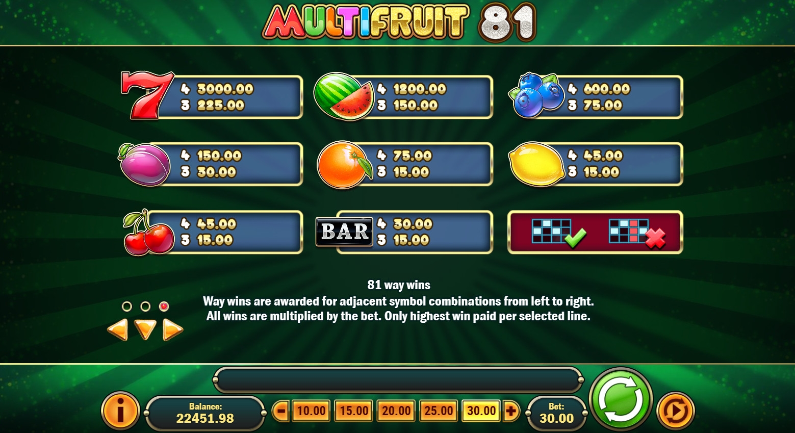 Для каждой из восьмидесяти одной последовательности, теоретически возможной в MultiFruit 81, предусмотрен отдельный коэффициент от х0.50 до х500. При расчете выигрыша он умножается на общую ставку.