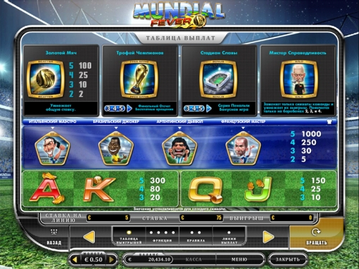 Mundial Fever - это пяти-барабанный видео-слот с 15-ю линиями выплат, производства Oryx Gaming. В игре используется "wild"-символ, символ "scatter", есть множитель, свободные вращения и бонусная игра.